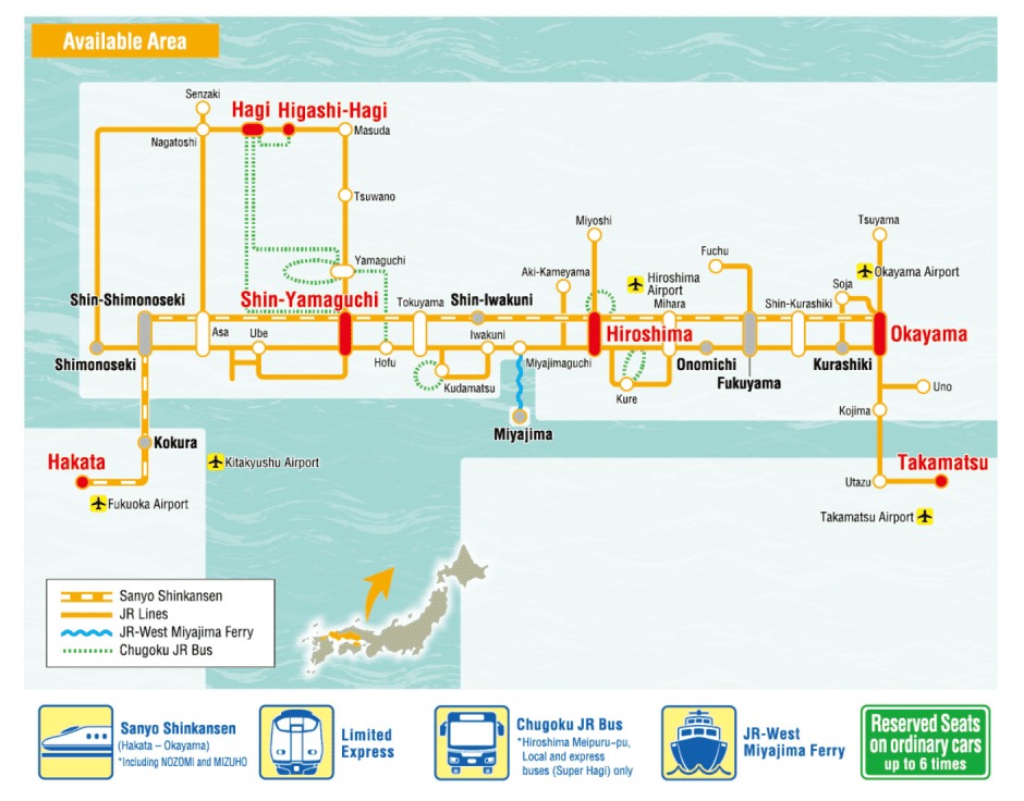 The Okayama - Hiroshima - Yamaguchi Area Pass gives you unlimited rides within the area shown on the map.