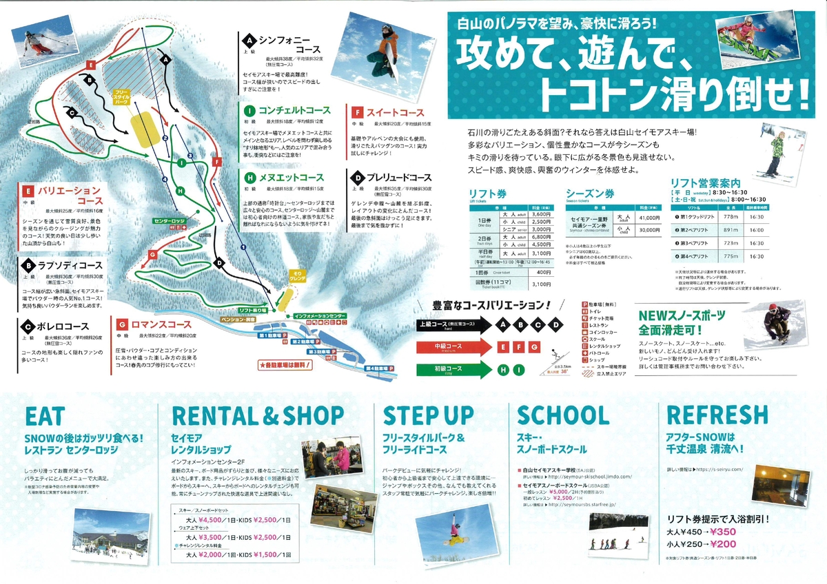 Dec. 20th to Mar. 22nd (Schedule is subject to change depending on snow conditions.)Hakusan Seymour Ski Resort features dynamic slopes and a wide variety of trails, offering thrilling runs and sweeping views that unfold beneath you. Feel the rush of speed and the pure satisfaction of an unforgettable ride.