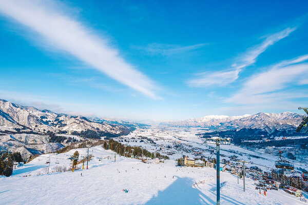The long-established Ishiuchi Maruyama Ski Resort celebrated its 75th anniversary last year. It is easily accessible—just 75 minutes from Tokyo by Shinkansen, followed by a 15-minute shuttle bus ride from the nearest station. Boasting one of the biggest ski areas in the Kanto region, you'll find natural snow, diverse terrains, a variety of slopes, and some of the best night skiing in Japan. This expansive ski resort offers a spectacular location unique to Ishiuchi Maruyama, with breathtaking views of the Minamiuonuma Plain and the Echigo Sanzan mountains.