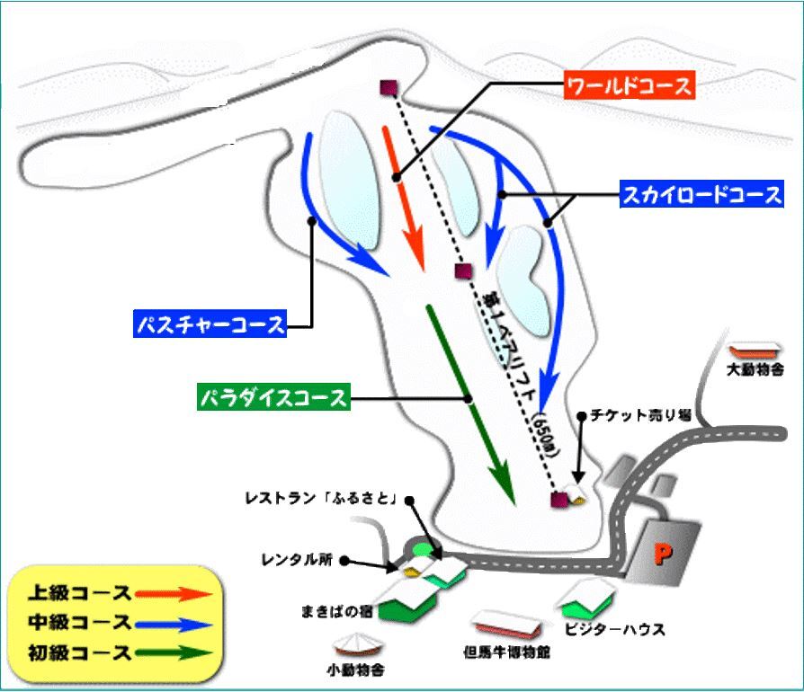 Located within Tajima Pasture Park, the ski resort features dynamic courses with undulating slopes, offering excitement for both beginners and seasoned skiers. The base area is wide and spacious, perfect for children to play in the snow and build snowmen. In addition to skiing, you can also explore the park's small animals.